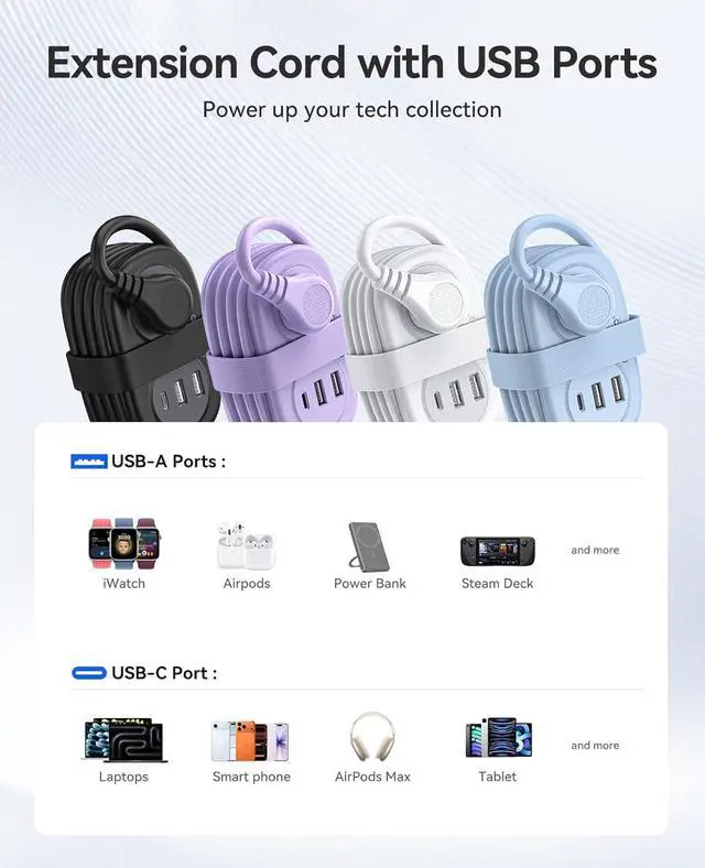 5-in-1 Travel Power Strip with USB C Port:OIRCO travel power strip with USB ports has 2 AC power outlets, 2 USB-A ports, and 1 USB-C port.