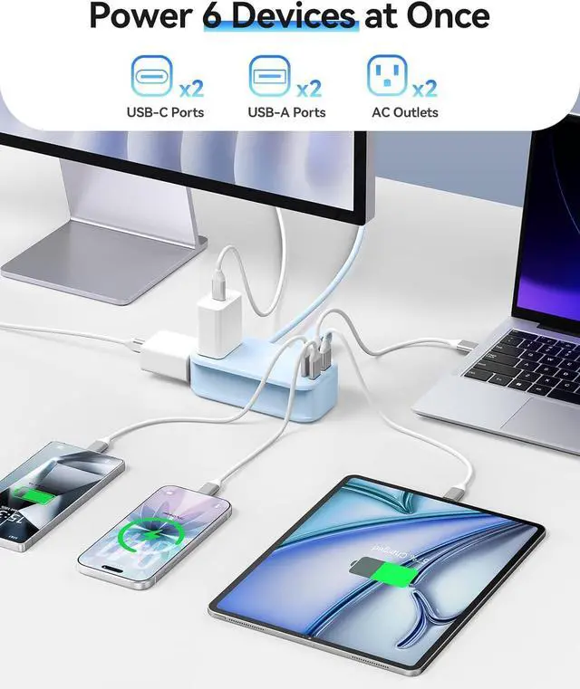 6-in-1 Multiple Outlets Power StripFeatured 2 AC outlets, 4 USB ports (2 USB-C+2 USB-A) can power up to 6 devices simultaneously, this charging station is a perfect combination of usb charger and power strip.
