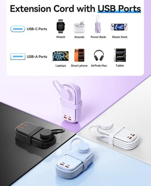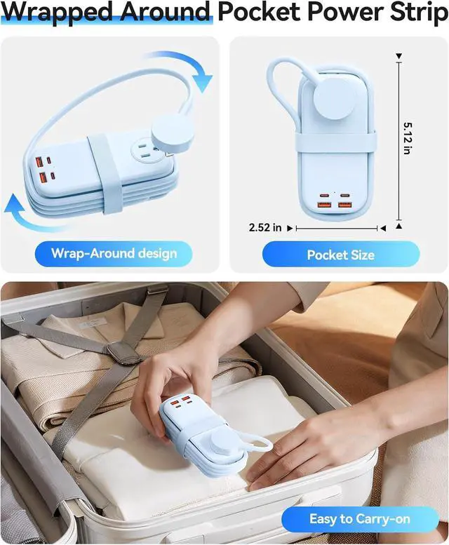 Compact Size & Wrap-Around Design for TravelThe ORICO portable power strip has small size (5.12*2.52*1.6 in) with flexible 5ft retractable wrap-around extension cord.