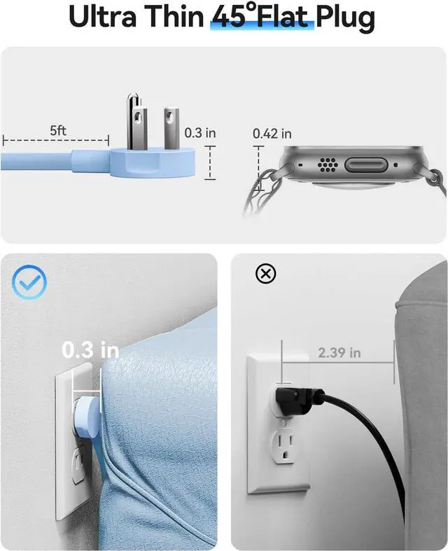 45° Flat Plug Power StripWith 0.43-inch thin flat plug and 45° right-angle design, the outlet extender can be easily installed in narrow places, such as behind furniture, sofa, bed, TV cabinet or bedside table.