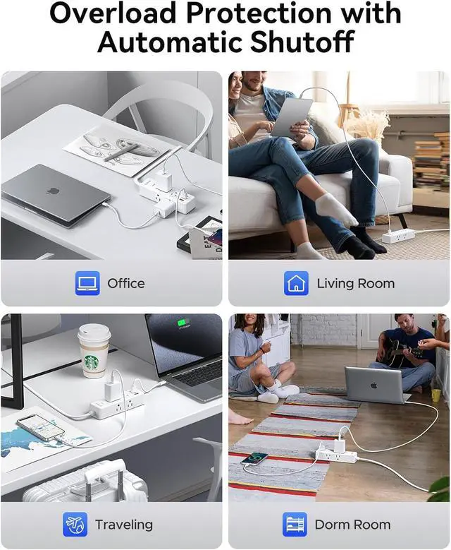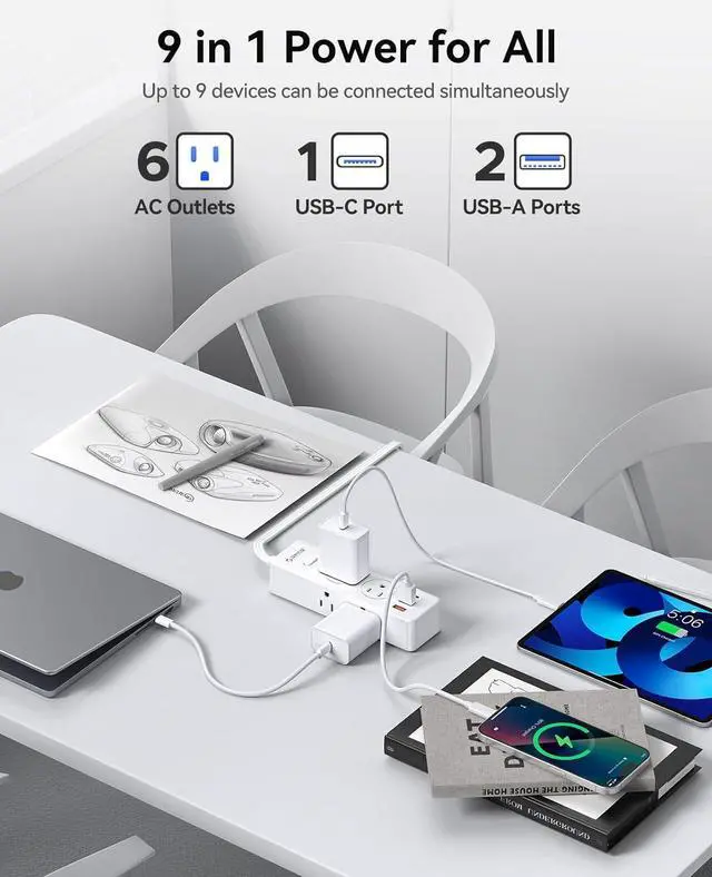 9-IN-1 Power Strip with USB C Fast ChargePower up 9 devices simultaneously. The power strip with multiple outlets for laptops, printers, and lamps. Includes 2 USB-A and 1 USB-C port for charging phones and tablets without adapters