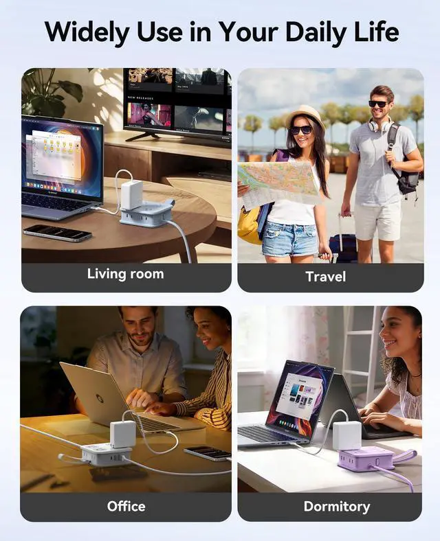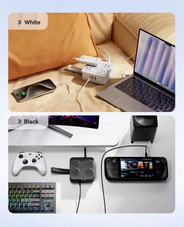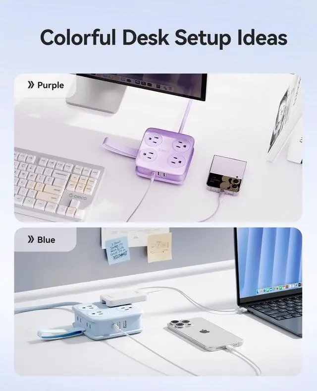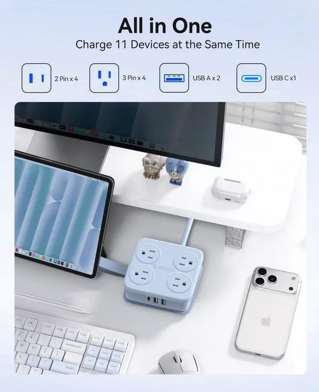 11 in 1 Power Strip for Desk: Features 8 AC outlets, 3 USB ports to power up to 11 devices. Its three-sided layout ensures clutter-four access with a spacious 1.83-inch outlet spacing.
