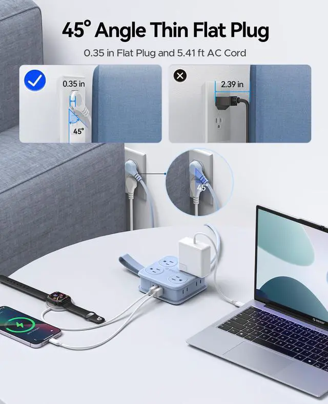 0.35 Inch Flat Plug: This plug is slimmer than common ones, allowing it to fit easily behind sofas, in bedside corners, or between desks and walls.