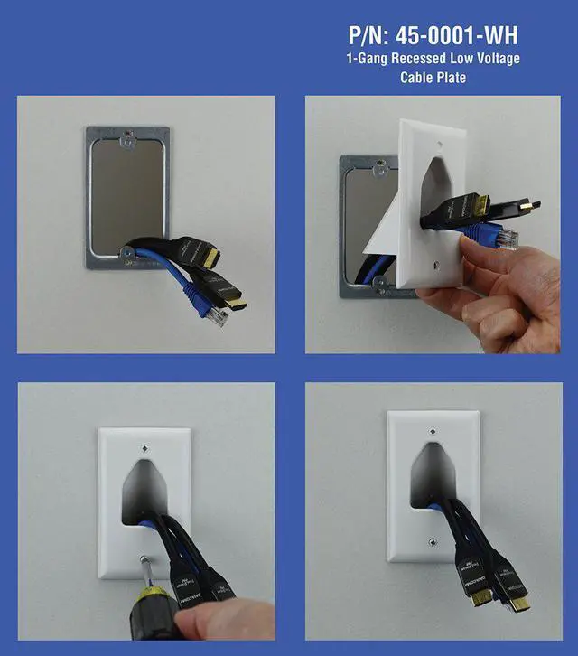 DataComm Electronics’ 1-Gang Recessed Low Voltage Cable Plates are used to install low voltage cables behind your flat panel TV, amplifier, or other audio and video devices. The cable plates can be installed with the opening facing up or down. These ETL listed cable plates are designed to be installed onto a low voltage mounting bracket.
