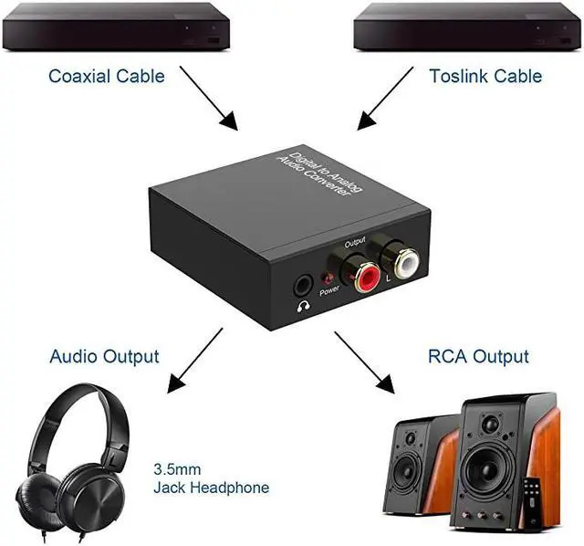 Output Audio Connector: 2 x RCA(R/L), 1 x 3.5 mm Jack; Powered by 5.5 mm USB Power Cable (Power Adapter is Included); Do Not Use Other Plugs, It Can Only Use 5V 1A Plug*****Supports Sampling Rate at 32KHz, 44.1KH z, 48KHz, 96KHz and; 24-bit S/ PDIF Incoming Bit Stream on Left and Right Channels*****Supports Uncompressed 2-channel LPCM or PCM Digital Audio Signal Output; Provides Electromagnetic-noise-free Transmission( 5.1 channel is incompatible, please set the audio output to PCM or LPCM*****Easy to Install and Simple to Operate; Can be Used for PS3, PS4, Xbox, Blu-ray Player, HD DVD, Home Cinema Systems, AV Amps, Etc