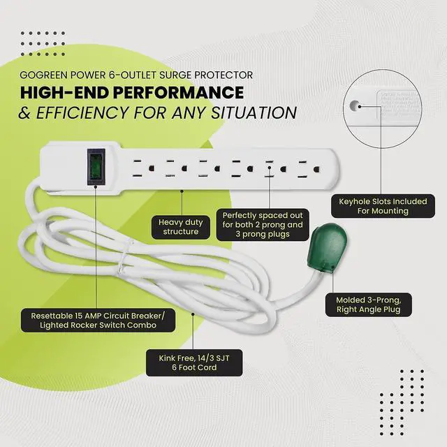 Sometimes you just need something a bit more heavy-duty to protect your computers, video game systems, televisions, and home appliances. Thankfully, the 6-Outlet Surge Protector has you covered with room to spare.With the GoGreen Power 6-Outlet Surge Protector, you'll have peace of mind knowing this 15 amp, 1875 watt circuit breaker is hard at work providing a whopping 250 joules of simultaneous protection for six adapters at once, making it a perfect defense against whatever Mother Nature throws your way. With an active indicator light to confirm operation, the 6-Outlet Surge Protector should be a standard feature in every room in your home.With a right-angle plug and extra-long six-foot cord, the GoGreen 6-Outlet Surge Protector implements the environmentally-friendly design of all GoGreen products with high-end performance and efficiency for any situation.