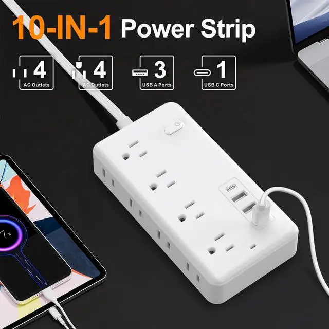 Flat Plug Surge Protector Outlet Extender Power Strip with Extension Cord, 8 AC Outlets, 4 USB Charging Ports (3 USB A & 1 USB C), Desk Charging Station, Compact Power Strip Outlet Extender for Home