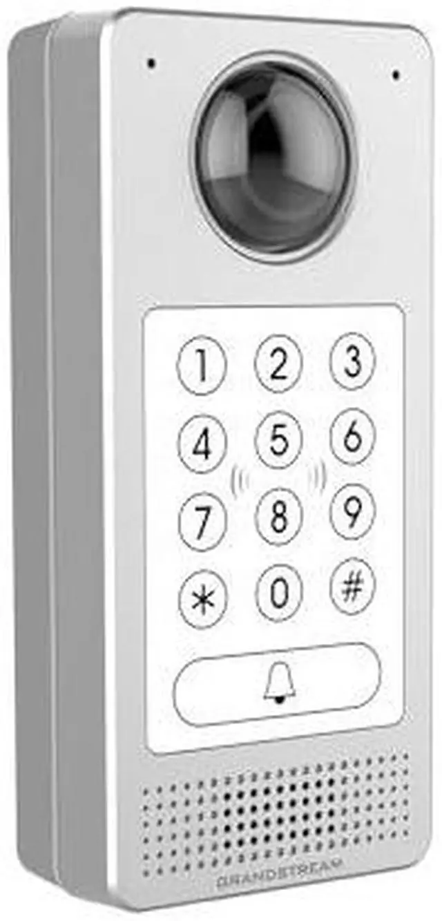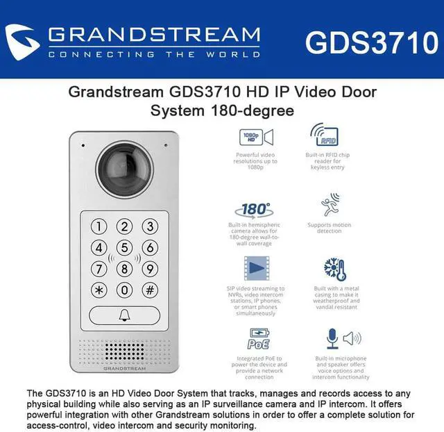 The GDS3710 is an IP Video Door System that also serves as a high-definition IP surveillance camera and IP intercom to offer facility access control and security monitoring for buildings of all sizes. This powerful IP Video Door System offers a 180-degree video viewing angle for wall-to-wall coverage, has a built-in RFID chip reader for secure keyless entry, includes a built-in microphone and speaker to support intercom functionality and offers alarm-in and alarm-out support for integration with existing security devices. The GDS3710 integrates with Grandstream's free management utility software, GDS Manager, allowing RFID card information, video feeds as well as the device itself to be fully managed by this software. By being ONVIF Profile S compliant, the GDS3710 can be integrated with any third party ONVIF compliant surveillance or recording solution. Powered by an advanced Image Sensor Processor (ISP) and state-of-the-art image algorithms, the GDS3710 delivers 1080p FHD video resolutions and offers exceptional performance in all lighting conditions. It features SIP/VoIP technology with 2-way audio and video streaming feeds loaded directly to smart phones, SIP endpoints and the GDS management software. The GDS3710 is equipped with integrated PoE for seamless installation, bright LEDs for illumination, motion detector for security protection, lighting control switch and more. The combination of the GDS3710, Grandstream's GXP21xx IP phones, GXV video phones and Grandstream Wave mobile app provide a complete solution for access control, video intercom, and security needs.