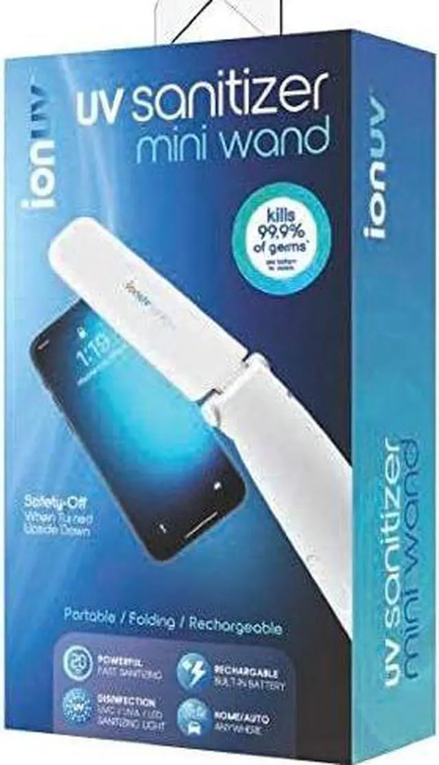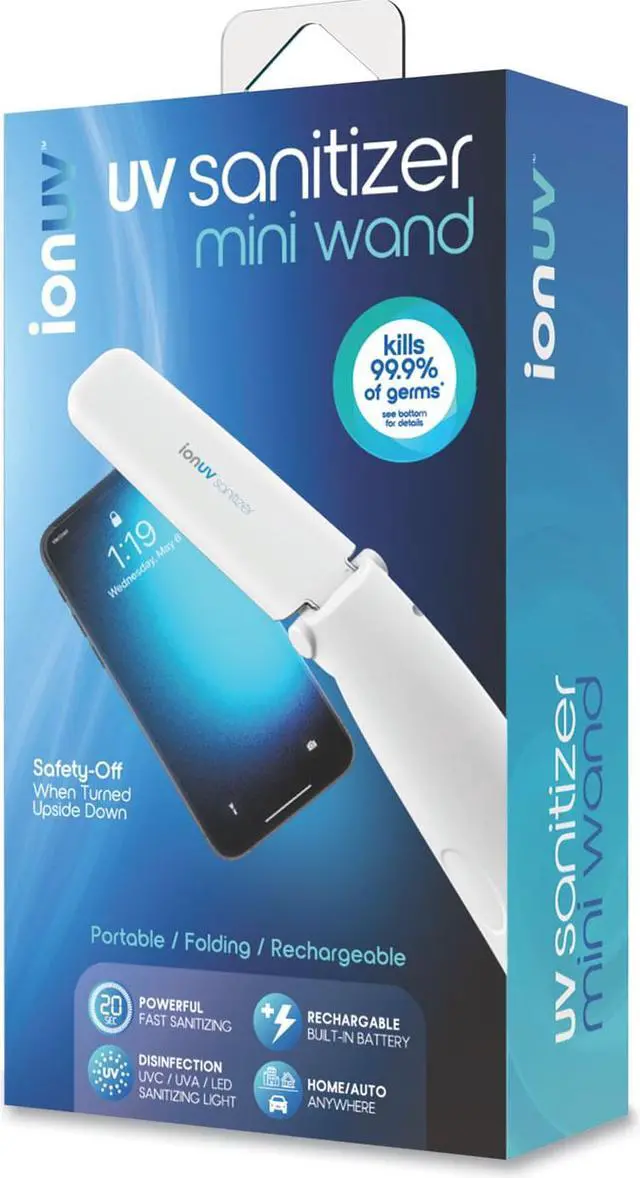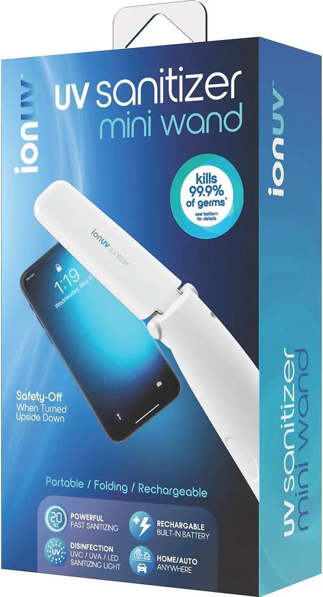 Wand handheld portable UV light sanitizer is a compact device that instantaneously kills germs and bacteria without the hassle of cleaning wipes or detergents.