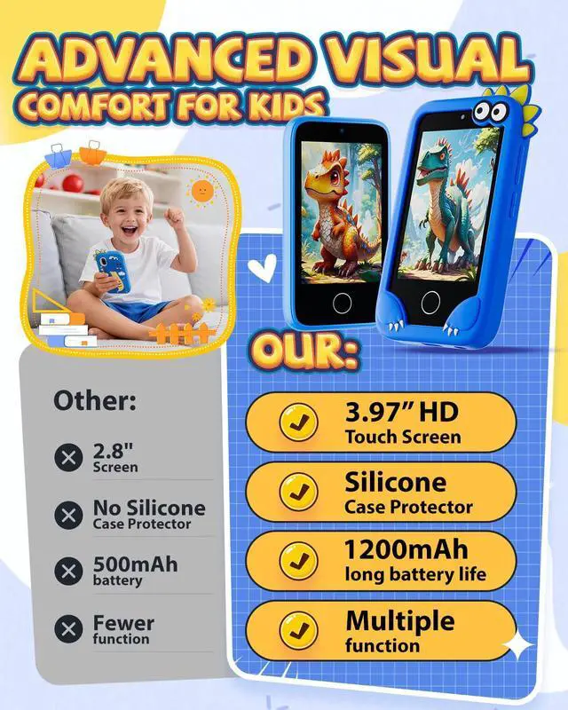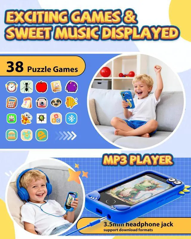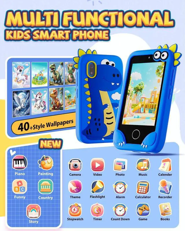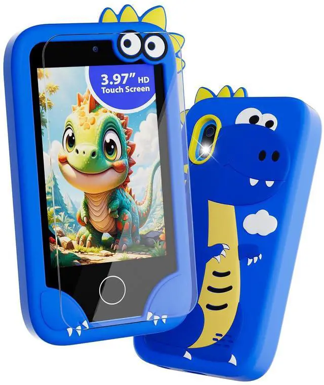 [Kids Multi-Functional Toy Phone]: Merge fun learning with thrilling adventure! This boys toy phone comes with a cool themed protective case thats a total hit with little boys. Equipped with dual cameras, it lets boys easily capture every "adventure moment" whether its a backyard exploration or a pretend safari. Loaded with educational apps (ABC Alphabet Learning, world landmarks, fable stories), puzzle games, music player, alarm, recorder, and more, its the perfect companion for boys to learn while having a blast.