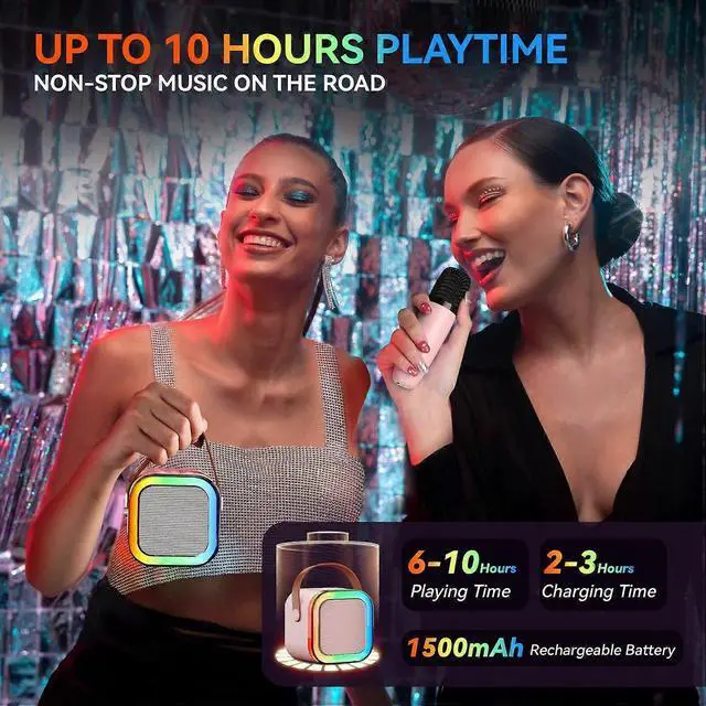 Bluetooth 5.0 & Dual Mics: Instantly pairs with stable transmission up to 50ft; includes 2 auto-connecting microphones for duets.