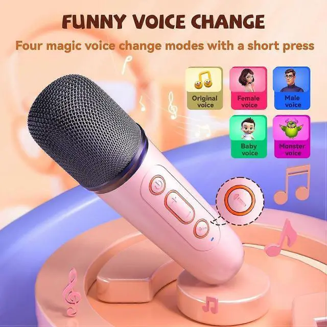 5 funny voice change effects (girl, boy, baby, monster, original) and rhythmic LED lights