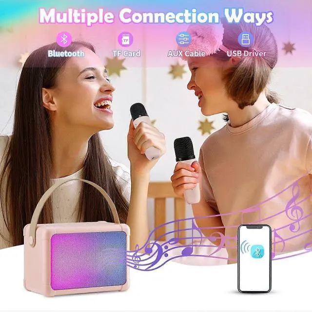 **2 Wireless Microphones**: Sing duets or host competitions without tangled wires.