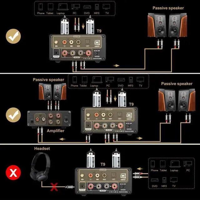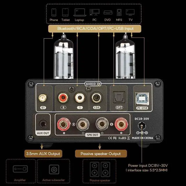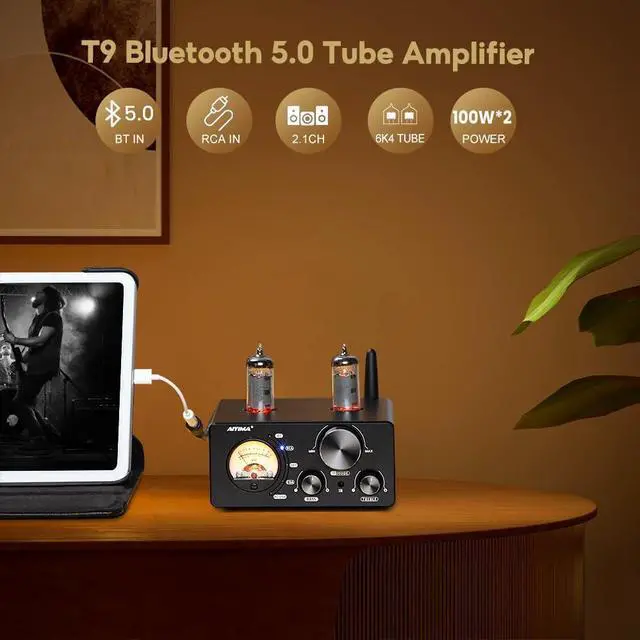 HiFi clear sound with tone control: resonable circuit and concise wiring, adopts vacuum tubes to soften the sound and filter out the digital feelings, sounds warm and sweet without noise. AIYIMA T9 bluetooth tube amp Also with treble and bass knobs to adjust one's own preferable sound styles, presents HiFi music with rousing highs and deep lowsUpgraded USB Dac AmpPractical functions to simplify use: with input selection and indicators, and you can cancel the hibernation prompt according to your needs, clearly to show the working status in real time; aluminum alloy case is specially designed, cool and unique to decorate your desktop space. With DC24V Power Adapter&With Remote Control (Not include AA Battery) Climate Pledge Friendly Certified by, Empowering Carbon Neutrality Goals. Voice for the Planet, Purity in Sound