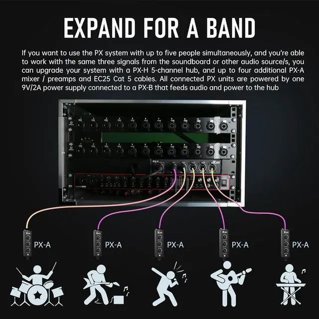 System: Can be expanded for use by up to five people simultaneously using a PX-H 5-channel hub, additional PX-A mixer/preamps, and EC25 Cat 5 cables
