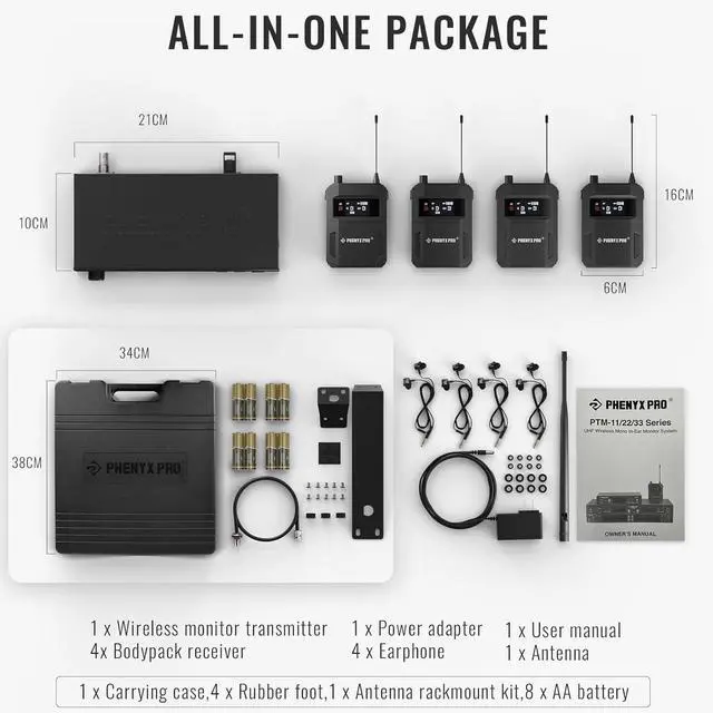 DESIGN: Experience a simple setup with smart design of the monitor inalambrico in ear. The sleek metal transmitter base, half-rack design, and black carrying case provide both durability and portability, while the adapter cord-off adds convenience. With one transmitter supporting multiple receivers, this phenyx pro in ear monitor is good for stage performances, studio recordings, and lectures, offering versatility across various sound-monitoring needsBOX