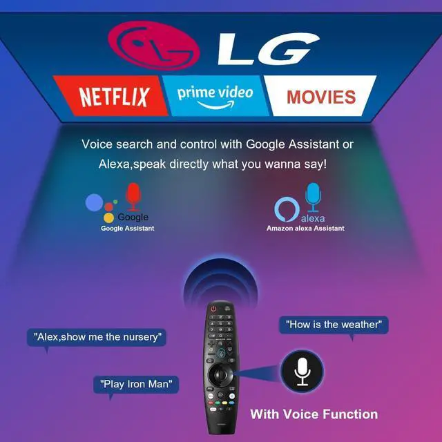 [Key Features] Vioce for lg Smart TV Remote Control AN-MR18BA makes interacting with your Smart TV easier! Intuitive mouse (e.g. pointing and scroll wheel controls) and quick access to your favorite content with preset app buttons for Netflix, Prime, Video Movies hotkeys.