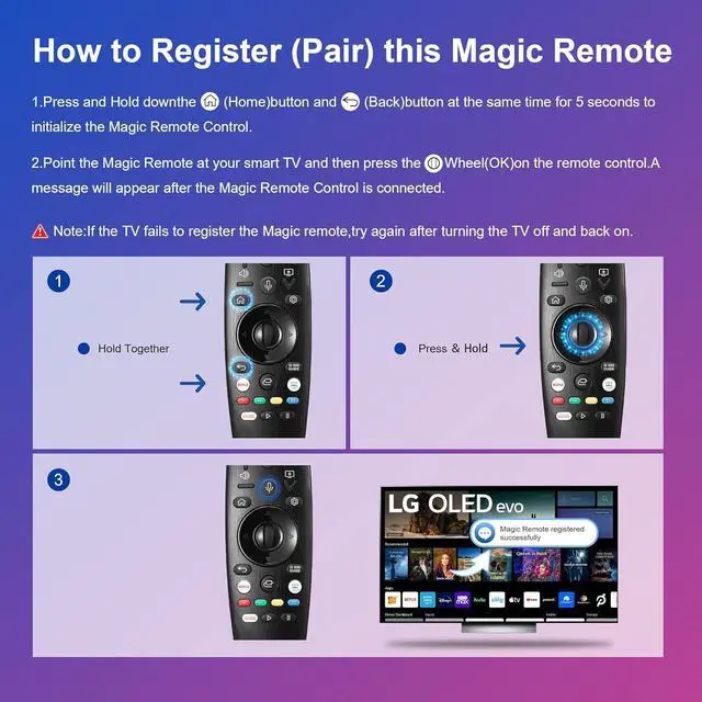 [Easy Pairing] (1) Place the battery in the replacement for the LG Magic Remote and turn on the TV. (2) Point the Magic Remote at the