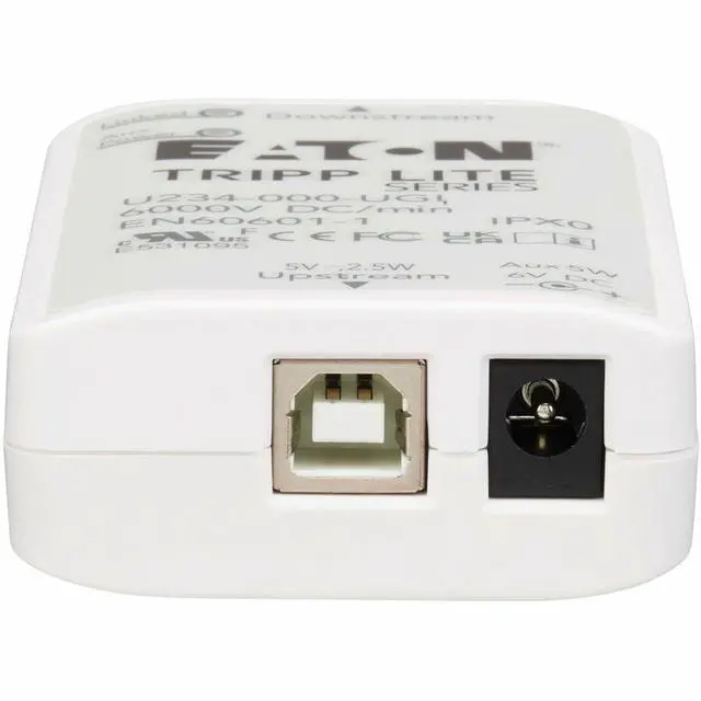 Features | Protects Sensitive Computing Equipment and USB Peripherals in Medical EnvironmentsThe U234-000-UGI makes it easier to integrate non-medical USB devices into ME (Medical Environment) systems by creating a 6kV DC isolation barrier between the host and peripheral to reduce risk from electrical surges and EMI (electromagnetic interference) /RFI (radio frequency interference) line noise. The isolator can protect critical equipment with 6, 000V isolation for up to one minute. The IP40 housing protects against solid substances of one millimeter or more. Complies with IEC 60601-1 Standards for Use in Patient Care VicinitiesThe U234-000-UGI complies with IEC 60601-1 and EMC/IEC 60601-1-2 safety standards for a network connection between a medical device and an Ethernet network or non-medical device (PC or laptop).