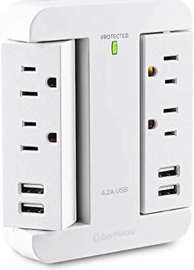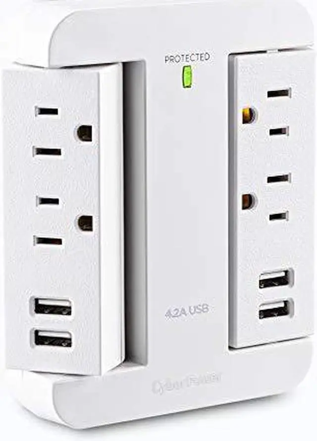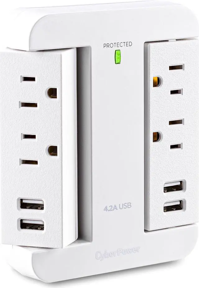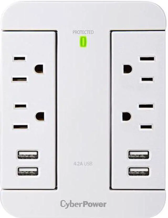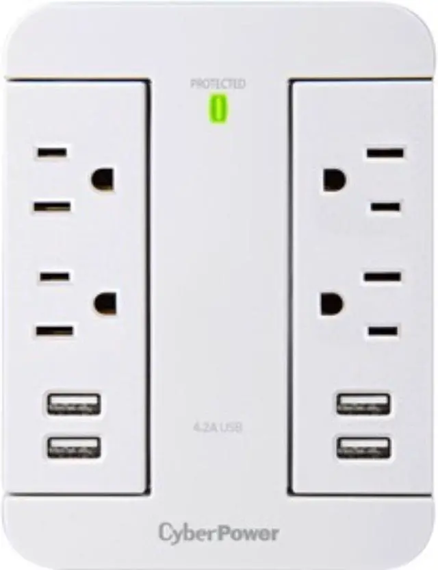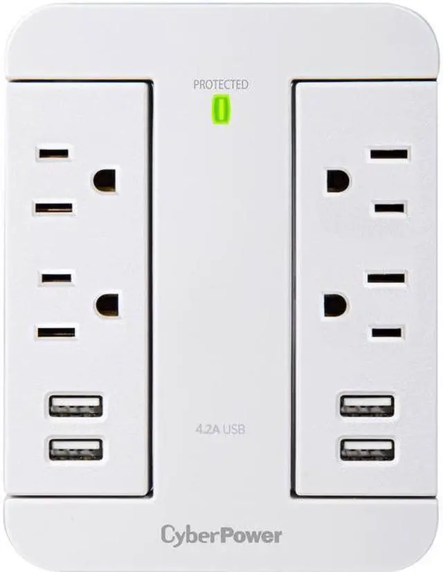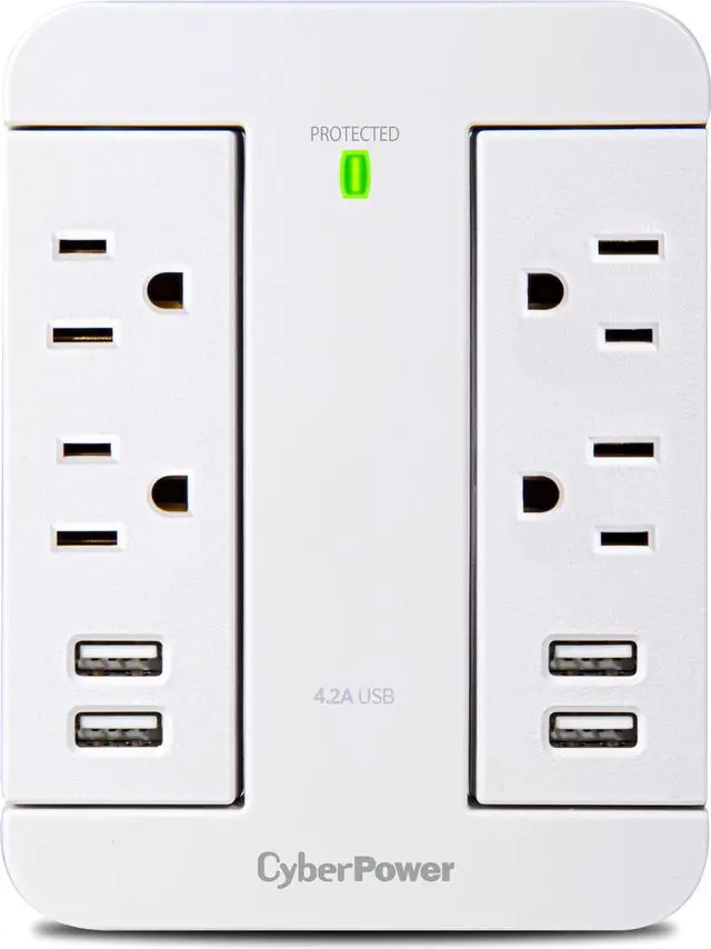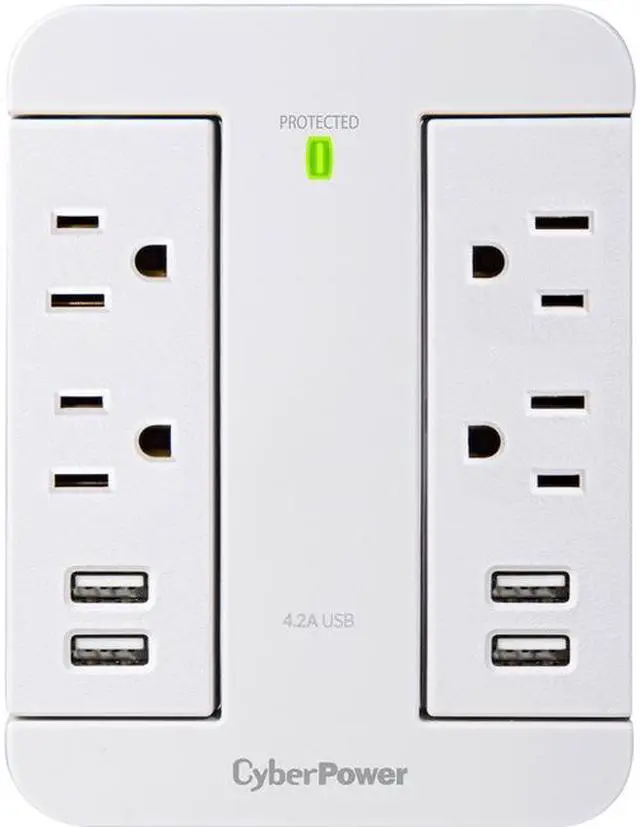 The CyberPower Home Office Surge Protector P4WSU expands a household outlet to safely and conveniently power several devices at a single location anywhere in the home. The wall tap design and swivel outlets make it easy to accommodate up to four power cords in tight plug-in locations. The four 4.2-Amp USB charging ports also swivel for efficient cord management.