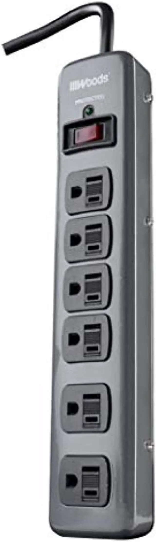 Woods 6-Outlet Surge Protector Strip - 6-outlet surge protector featuring 2 different spaced adapters for a wide variety of applications. Includes metal construction, dark gray housing with black outlet safety cover, straight plug type, and illuminated indicator switch.