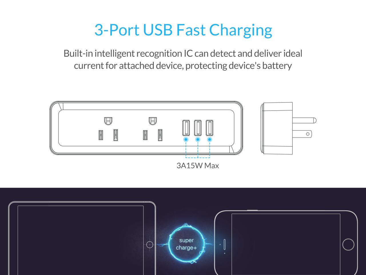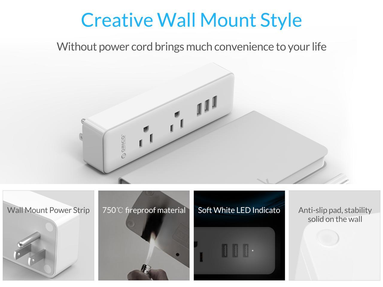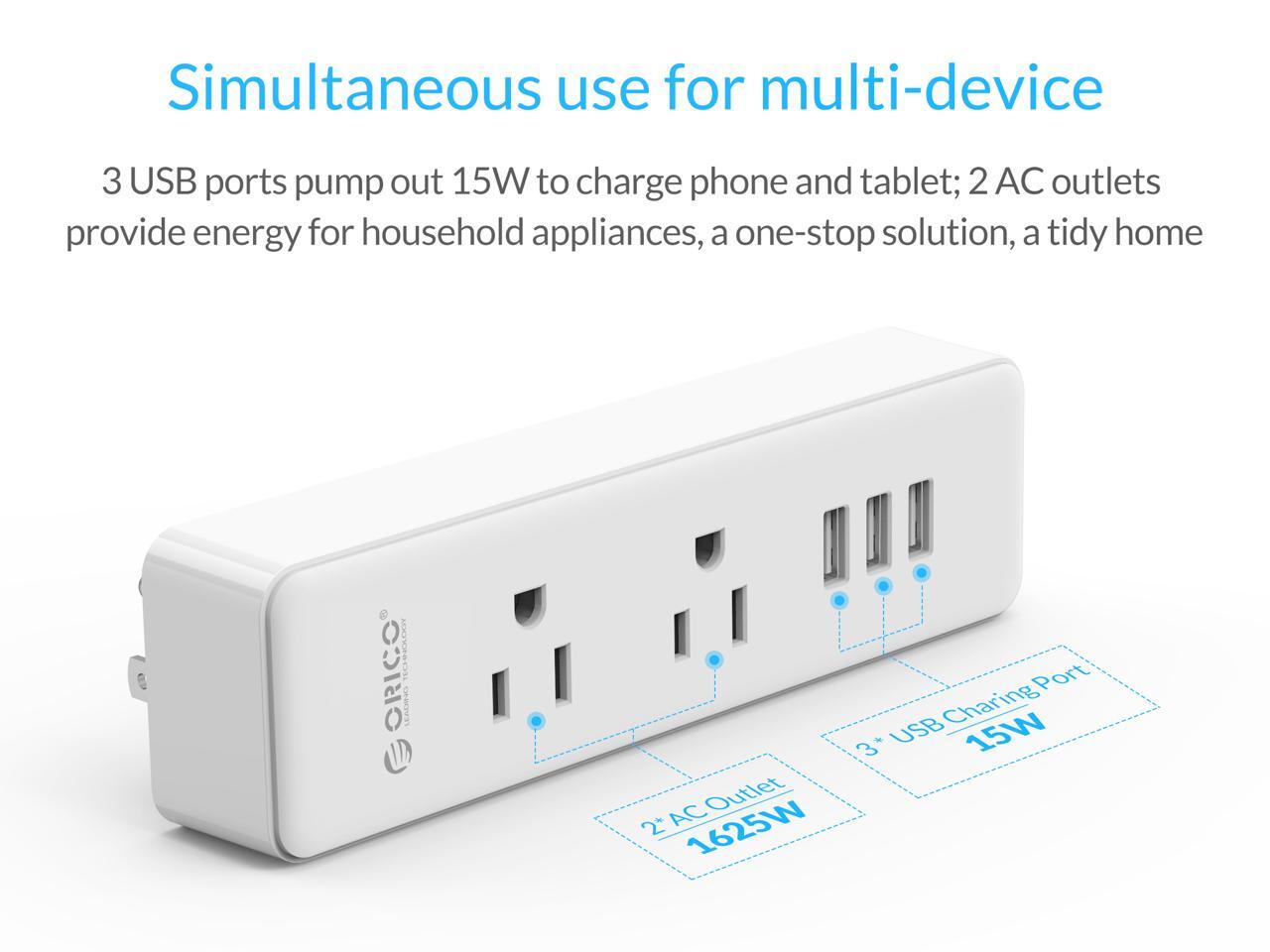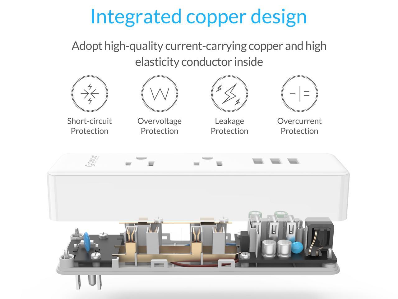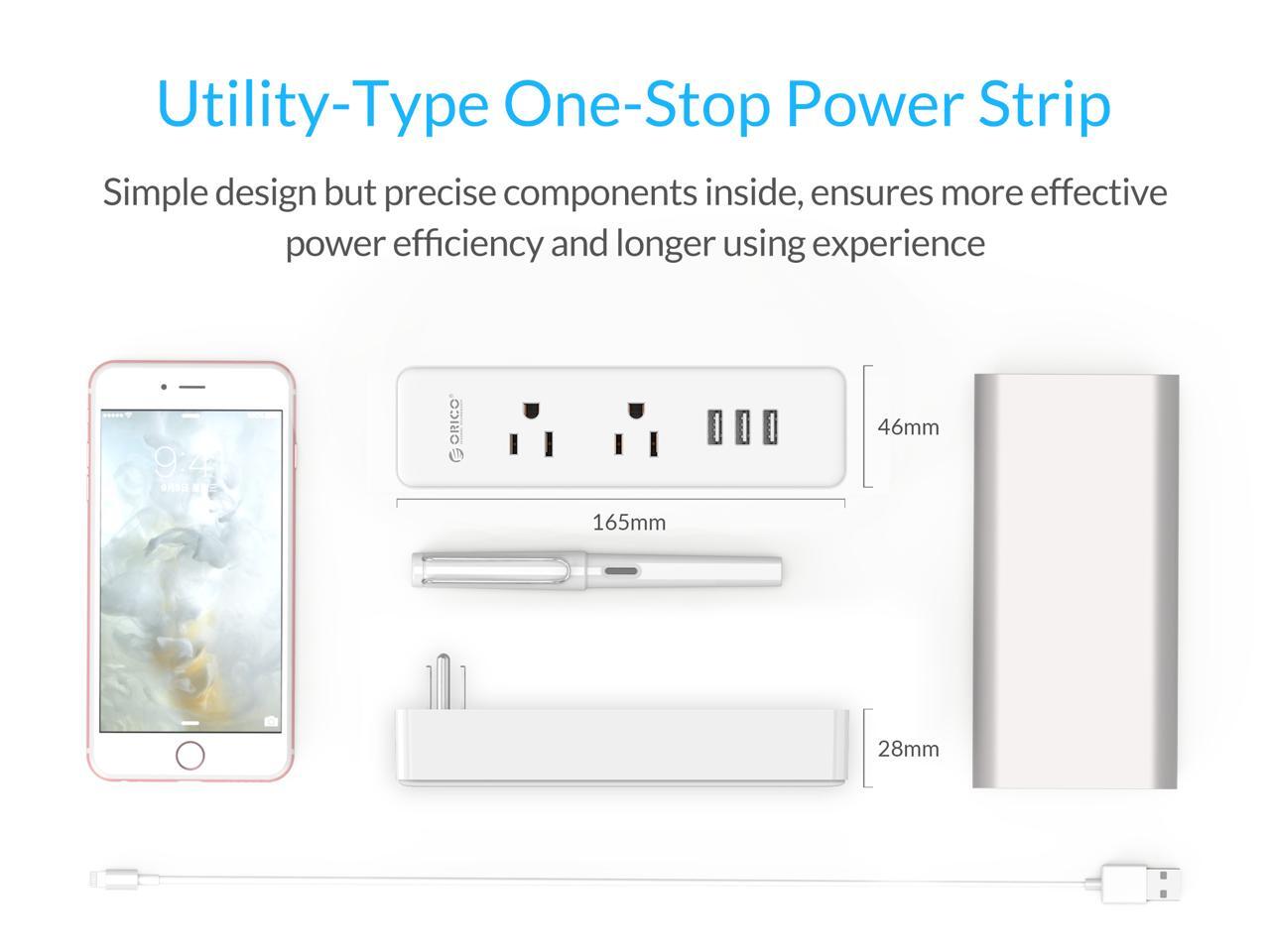ORICO MNP-2A3U Smart USB Power Strip - Compact & Portable3-Port USB +2-New Standard AC Outlets, Durable Heat-Resistant Material, Safe, Energy-Saving, Stylish, Lightweight Design for On-the-Go Use