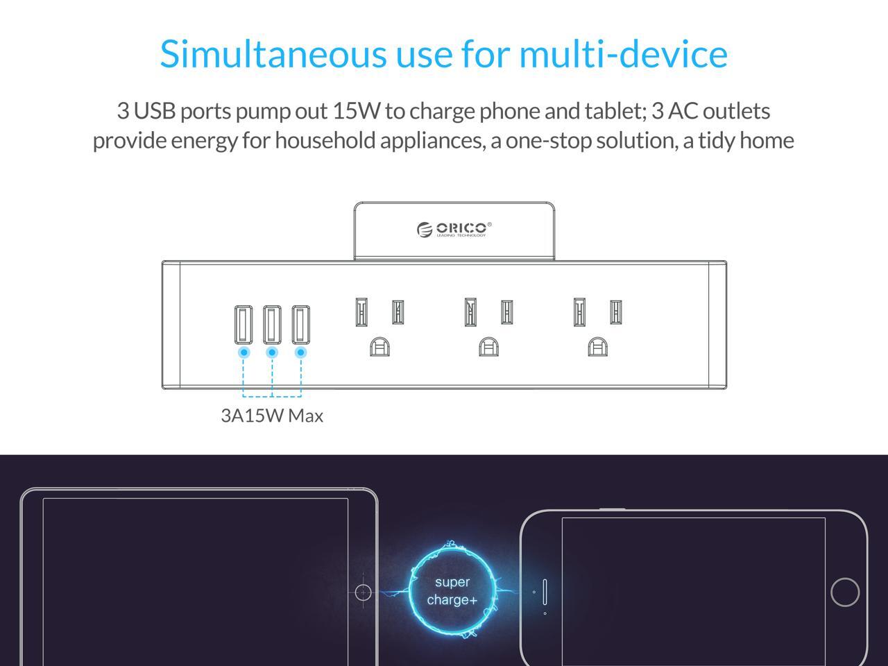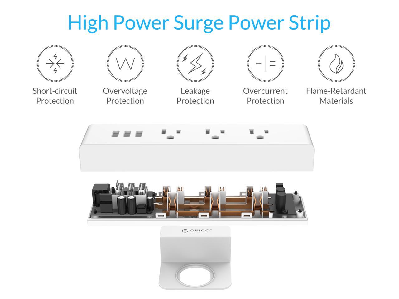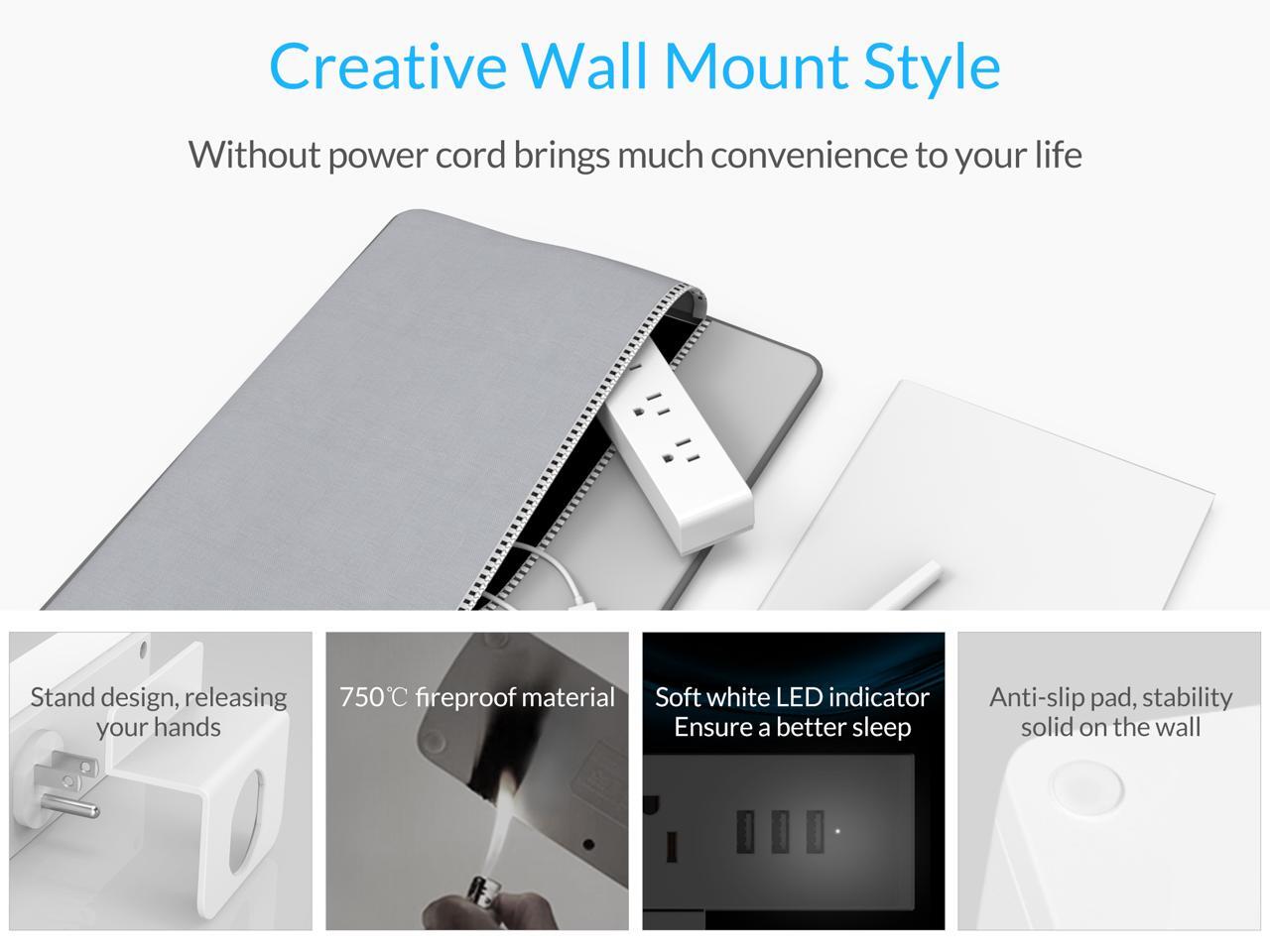 ORICO Wall Mount 3 Outlets Power Strip 3 USB Charging Ports with Phone Holder Stand 5-foot Heavy Duty Extension Cord for Home, Office, Travel and Business -White