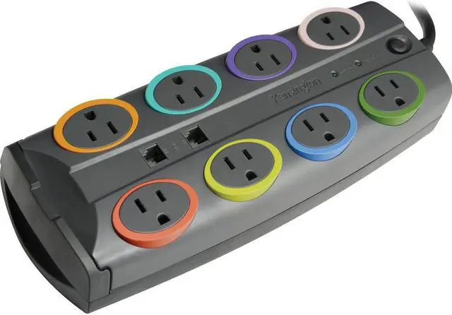 SmartSockets combines features and visual excitement to provide superior surge protection to your electronics against power spikes, brown outs, and black outs. Color-coded rings with matching color labels for easy connected equipment identification and cord management. 8-outlet, 8-ft cord, with 3090 joule rating. Right-angled plug for easy accessibility. $50,000 limited connected equipment warranty.
