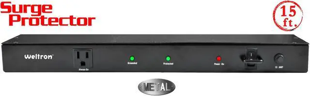 Nine Outlet Rack Mount Power Strip w/ 15ft Cord. This Power Strip is perfect for any 19" rack and has EMI/RFI noise filtering and full 3 line Surge Protection. Includes protection of 2450 Joules and LED Surge/Ground indicators. Easily mounts on or under any desk also.