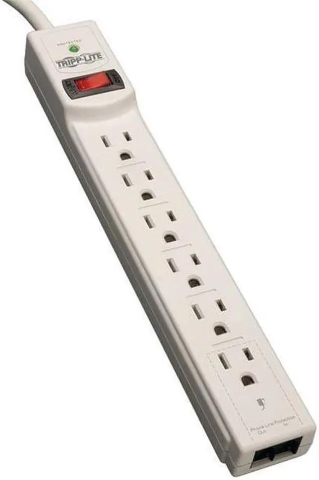 6 OUTLETS 990 JOULES ROOM FOR 1 TRANSFORMER PLUG WITHOUT BLOCKING OUTLET COVERS COMPUTERS & PERIPHERALS PROTECT ALL ELECTRONICS AGAINST SURGES, SPIKES & LINE NOISE AC SURGE SUPPRESSION SHIELDS EQUIPMENT FROM THE STRONGEST SURGES & LINE NOISEPHONE LINE SURGE SUPPRESSION PROTECTS BOTH DIALUP & DSL MODEMS, PLUS FAX MACHINES, CORDLESS PHONES & MORE (PAIR OF RJ11 JACKS, 2 WIRE, 1 LINE, INCLUDES 6-FT PHONE CABLE) BUILT-IN POWER SWITCH5 AMP CIRCUIT BREAKER OFFERS POWER CONTROL & OVERLOAD PROTECTION8-FT CORD$20,000 ULTIMATE LIFETIME INSURANCELIFETIME PRODUCT WARRANTY;