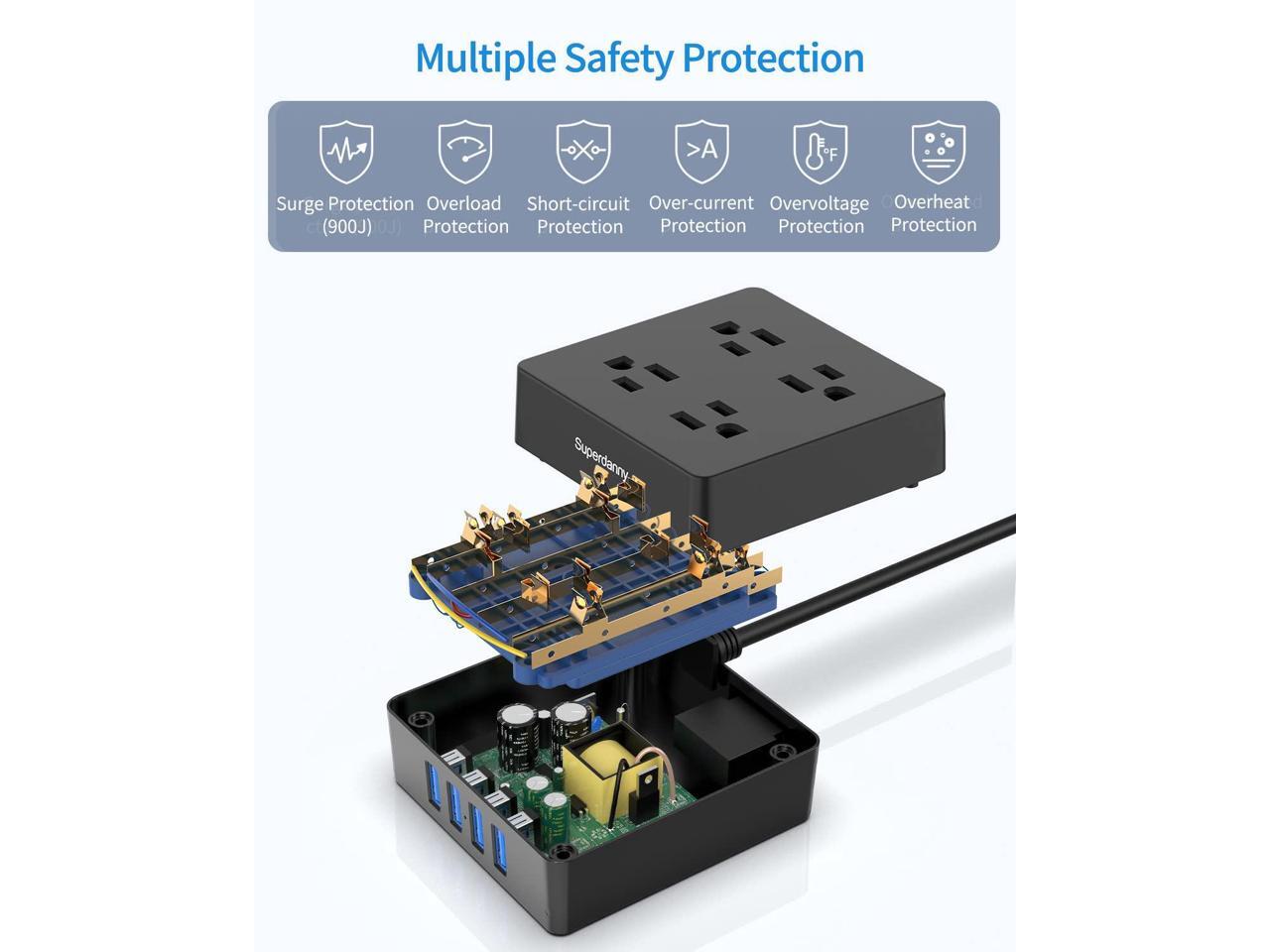 - All-Round ProtectionWith a built-in 900J surge protector, our electrical multi-outlets will filter the minor surges in the circuit and shut off when an overwhelming surge occurs, like that caused by lightning. And the shell is made of Flame Retardant Material which is able to withstand temperatures high up to 1,380 (750).