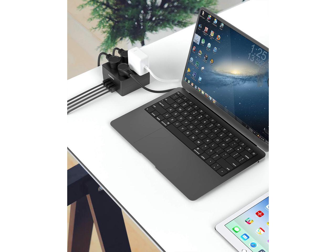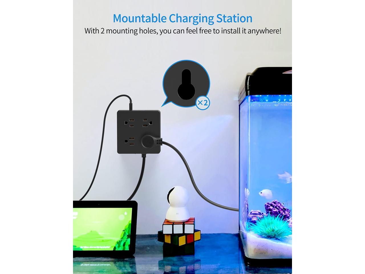 - All-in-One4 widely spaced AC outlets plus 4 smart-charging USB ports (5V/3.1A shared), enough to accommodate your phone, AirPods, earbuds, headphones, smartwatch, Bluetooth speaker, PS5, tablet, computer, laptop, TV, table lamp, printer, scanner, and other electronic devices in an efficient, smart and safe way.