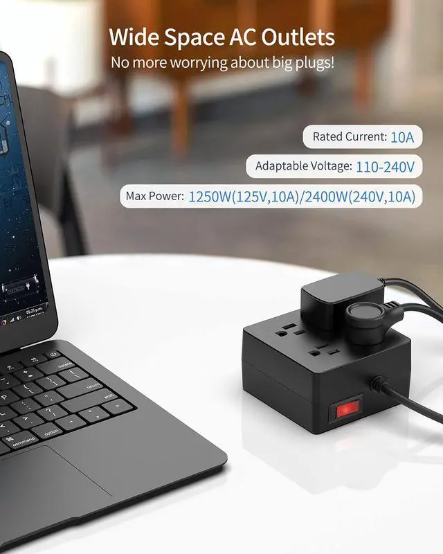 With a small footprint, this compact power strip fits nicely on the office desk, bedroom nightstand, the kitchen in the RV, or dresser in the dorm, especially for hotels that may have limited or hard-to-reach outlets.