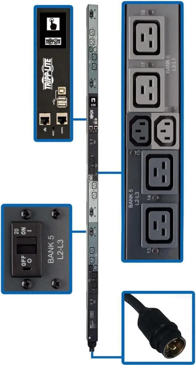 This monitored PDU provides real-time remote monitoring of voltage and load levels via its built-in network interface. Ideal for your data center, computer room or high-density network closet, the PDU3EVNR6H50A features six C13 and 12 C19 208V outlets in six breakered load banks, which distribute AC power to rack equipment. Plug-lock insert sleeves are included to prevent equipment cables from becoming accidentally dislodged.