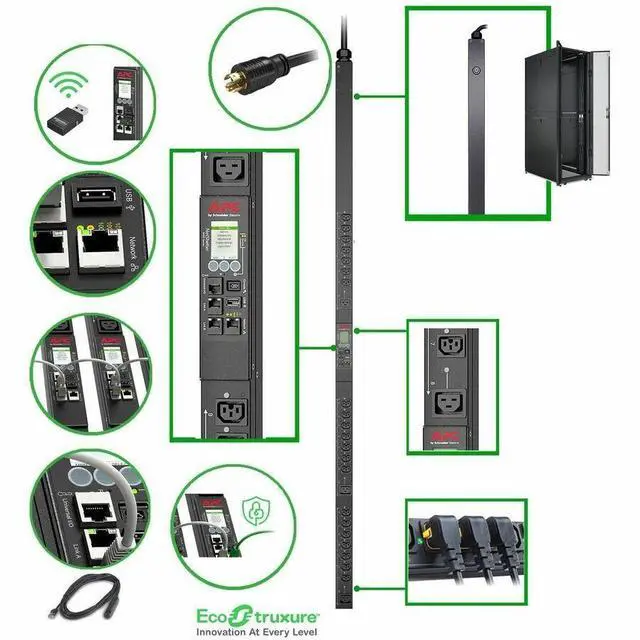 Next generation APC Switched Rack PDU offers enhanced reliability with remote monitoring and load control by individual outlet | Input: NEMA L21-20P. Output: C13/C15 (21), C19/C21 (3) | Individual outlet on/off control, sequencing, grouping | Wireless Connectivity: Connect wirelessly to this next generation APC PDU with a APC's USB Wi-Fi Device (sold separately, model AP9834) | Toolless Rack Mounting Capability: This vertical PDU does not require additional tools to mount into APC NetShelter Enclosures