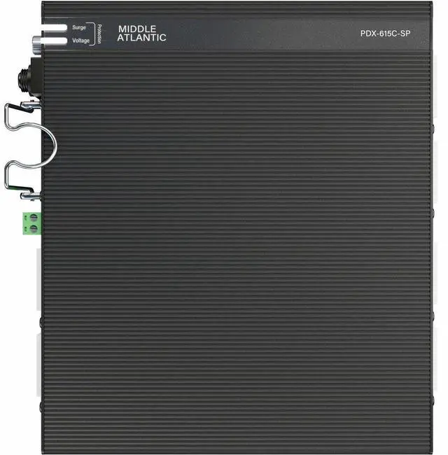The Middle Atlantic PDX-615C-SP is a compact NEXSYS PDU designed for 'behind-the-display' applications, particularly digital signage. It features (6) NEMA 5-15R outlets and operates at 15A. The PDU offers flexible mounting options with both clamp and L-brackets, which can be easily attached to a Lever Lock plate for tool-free installation inside a rack, kiosk, or in-wall box. It includes Series stage MOV surge protection with 3 stages and visual indicators of surge status on the front and side. The selectable on/off voltage protection from the dry contact port helps safeguard sensitive equipment from over/under voltage scenarios by automatically turning off the outlets during such events and restoring them once the power is within the acceptable range. The PDU also supports cleaner cable management with a standard 2ft power cord and allows for the use of both outlets without obstruction, thanks to the orientation designed for easier plugging of DC transformers (wall warts).