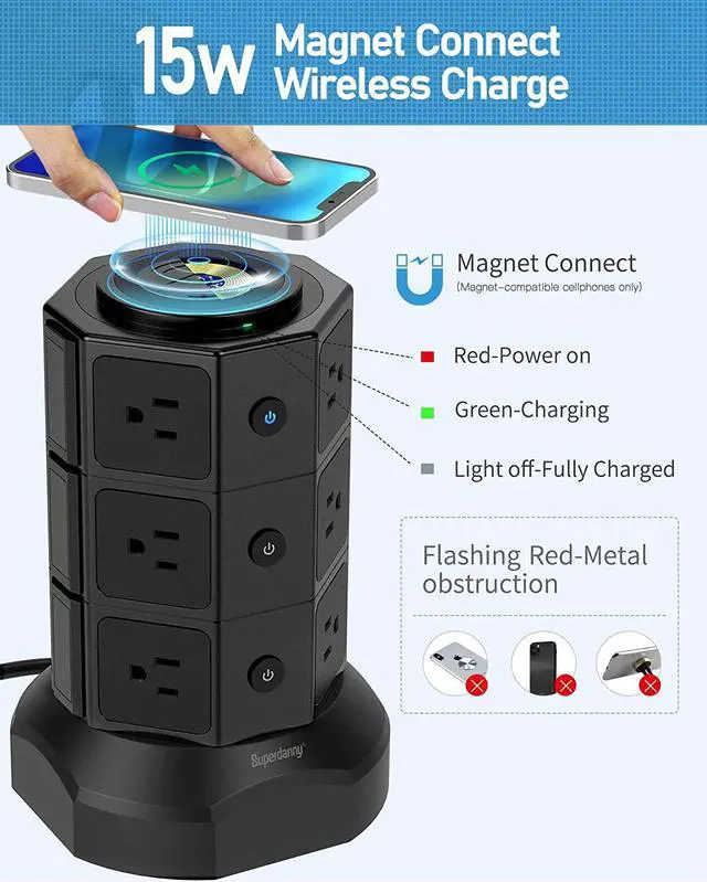 Built with a magnet connecting feature, the wireless charger on top offers 5W/7.5W/10W/15W output for QI-enabled devices; What you need is just place your phone on top of the tower, and your phone will be automatically connected and stay on it being charged without falling, sliding or disconnecting. (compatibility with magnet alignment feature is required for the cellphone.)