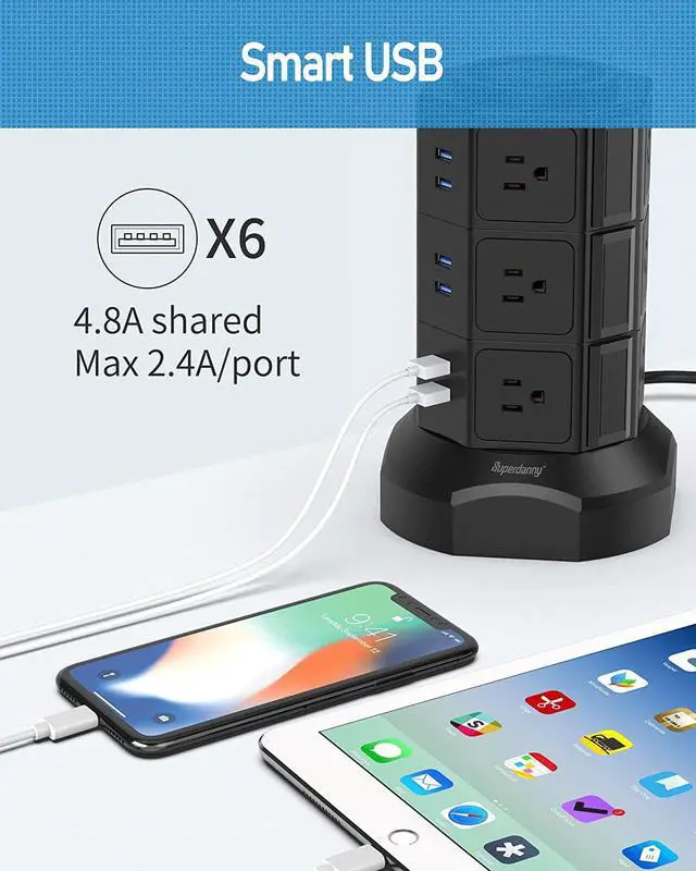 Powerful and Efficient:The small footprint power tower allocates 12 AC outlets and 6 smart charging USB ports on 4 facets vertically, perfect for large bulky plugs or adapters and multiple uses at the same time; With independent switch on each layer, all devices connected to this tower can be managed by one push efficiently with no energy wasted; 5V/4.8A shared by 6 USB ports, 0-2.4A each.