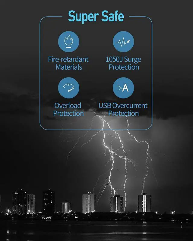 There is a reset switch for short-circuit/surge/overload protection, and up to 1050 Joule lightning proof to protect you, your devices, and your home. When this 12-outlet multi-plug is overloaded, it will automatically power-off, so that your expensive devices will not be damaged. After that, you just need to reset it, the power strip will instantly turn on again!