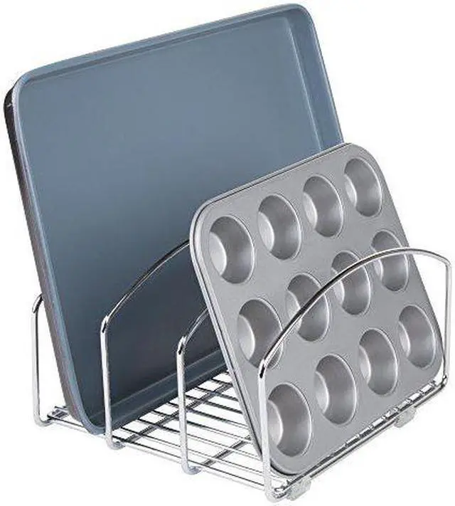 Organize your kitchen with the iDesign Classico Kitchen Cookware Organizer! This rack is perfect for organizing all your cookie sheets, cutting boards, and muffin tins. This organizer helps you save precious cabinet and countertop space and features three wide spaces that provide ample room for all of your flat cookware. Constructed of durable steel with a stylish chrome finish, this rack is perfect for your kitchen decor. The wired bottom makes this organizer perfect for allowing your cookware to dry. The iDesign Classico Kitchen Cookware Organizer measures 8.4" x 9.95" x 5.55", perfect for your kitchen.