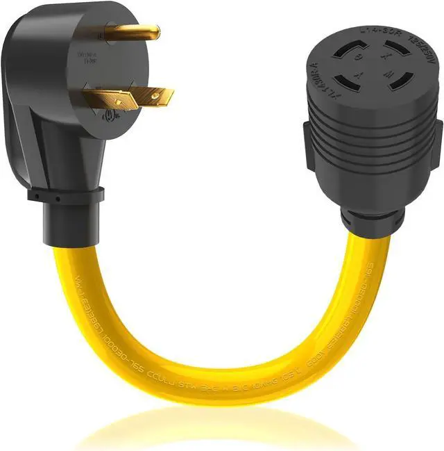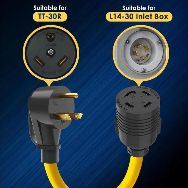 [Cord Rating] 3 prong NEMA TT-30 plug to L14-30 generator locking outlet connector. 1 FT 10 gauge, Rated for 125V max rate 3750 watts. UL Listed.
