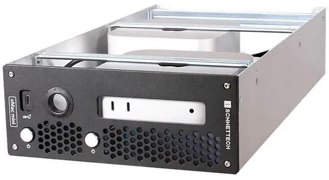 Mac mini ExpansionModular Expansion + AccessibilityxMac mini (2024+) Module is the heart of Sonnet's xMac mini (2024+) Enclosure Systems. The module securely holds one or two Mac mini (2024+) computers (sold separately) in a rugged steel frame, which is designed to install into a compatible Sonnet desktop or rackmount enclosure or modular expansion system. Front power buttons and connectivity as well as open access to the computer's ports in back offers versatile accessibility. Power Button to Each ComputerFront panel power buttons conveniently and reliably activate Mac minis' bottom-mounted power switches. USB-C Ports AccessProvides open access to the front panel ports of the front-mounted Mac mini, with a passthrough USB-C port to the rear-mounted Mac mini, if installed.