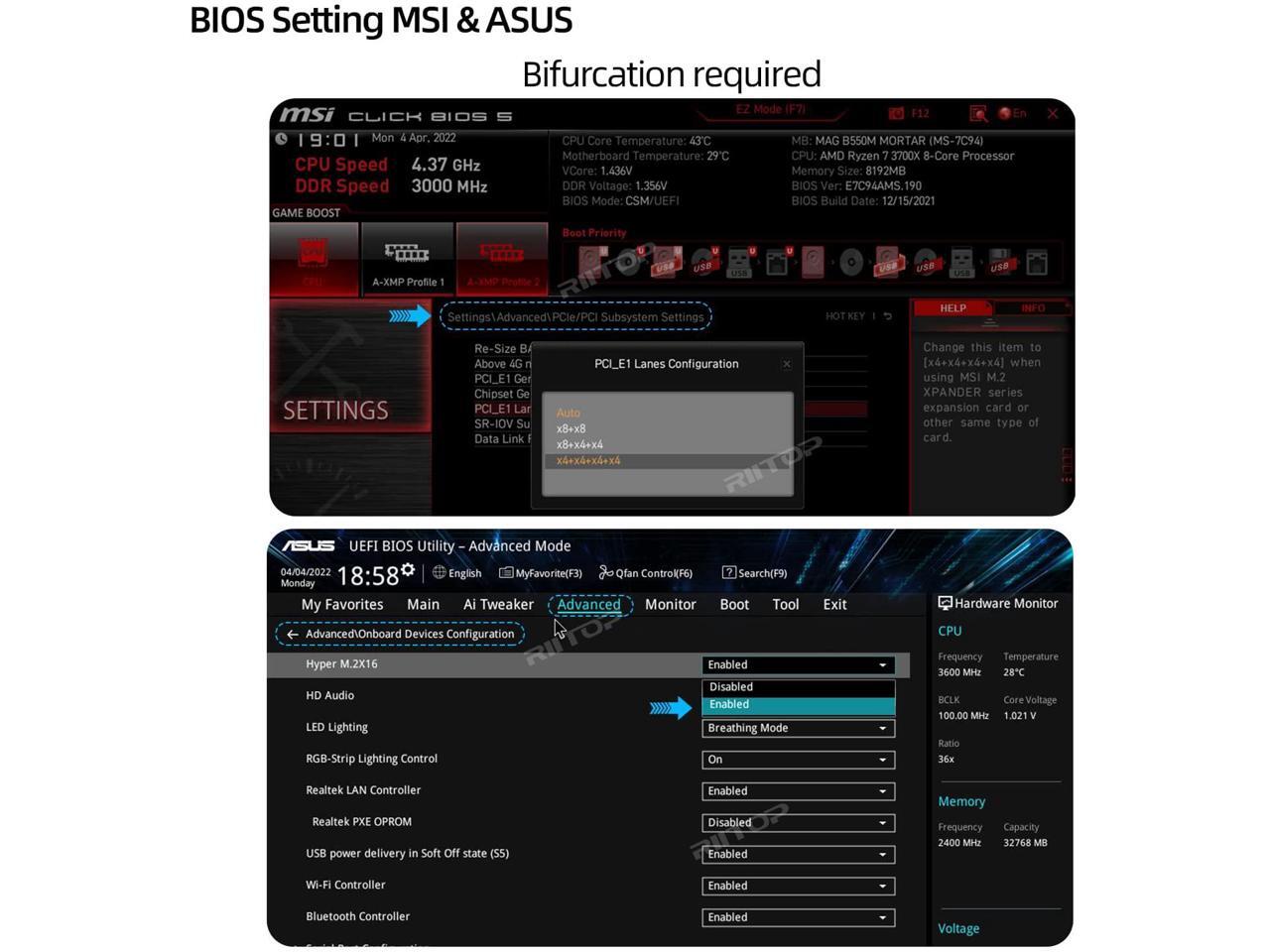- 2. The motherboard can support PCIe x16 Bifurcation itself, and can be set as"PCI-e x4x4x4x4" 3. All of the SSDs are M.2 (M Key) NVMe SSD 4. CPU has enough channels to support.