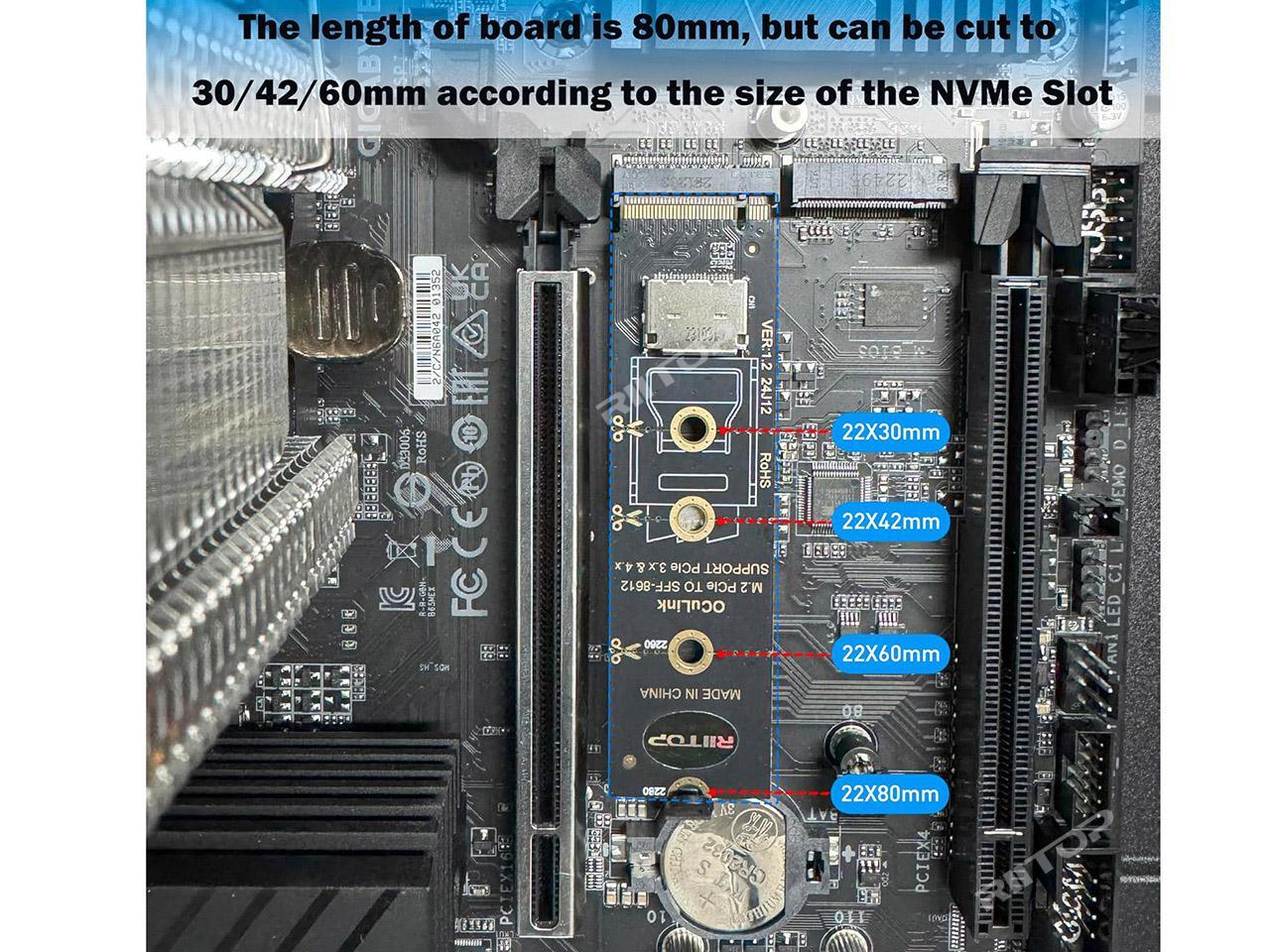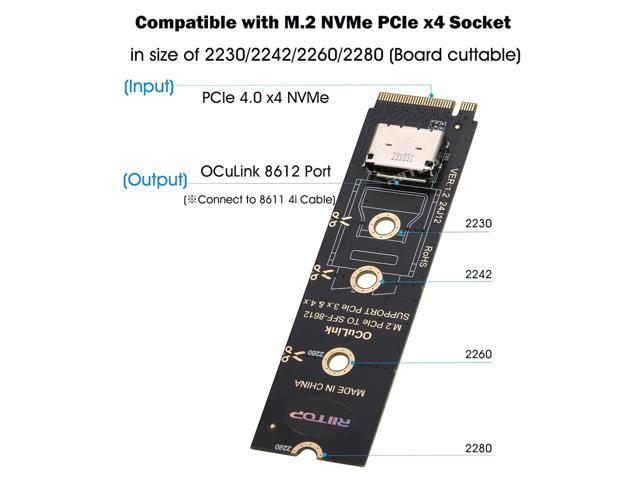 - NVMe to OCuLink Adapter supports PCIe 4.0/3.0 x4, Data transfer rate up to 64Gbps, there is no speed limited. The NVMe to SFF-8612 Board's full length is 22x80mm, but it can be cut to short size 22x30mm, 22x42mm, 22x60mm to fit different size of SSD Socket.