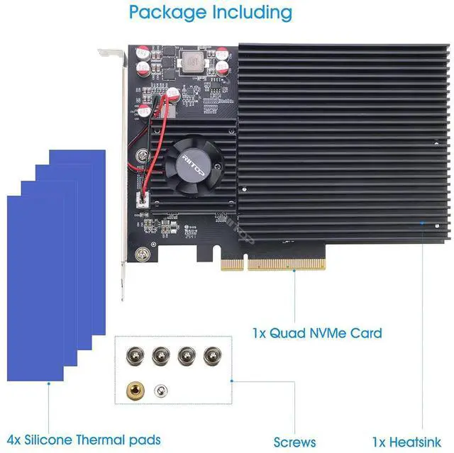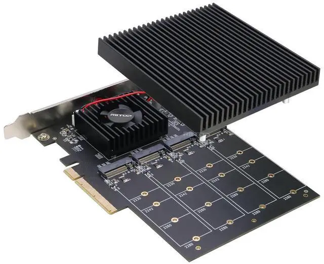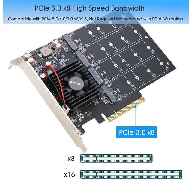[PCIe 3.0 x8 HighSpeed Bandwidth] ] RIITOP Quad NVMe Adapter Utilizes a PCIe 3.0 x8 interface, delivering up to ~8 GB/s Total Bandwidth. Enables simultaneous highspeed read/write operations across all drives, ideal for gaming rigs, video editing, and dataintensive tasks.