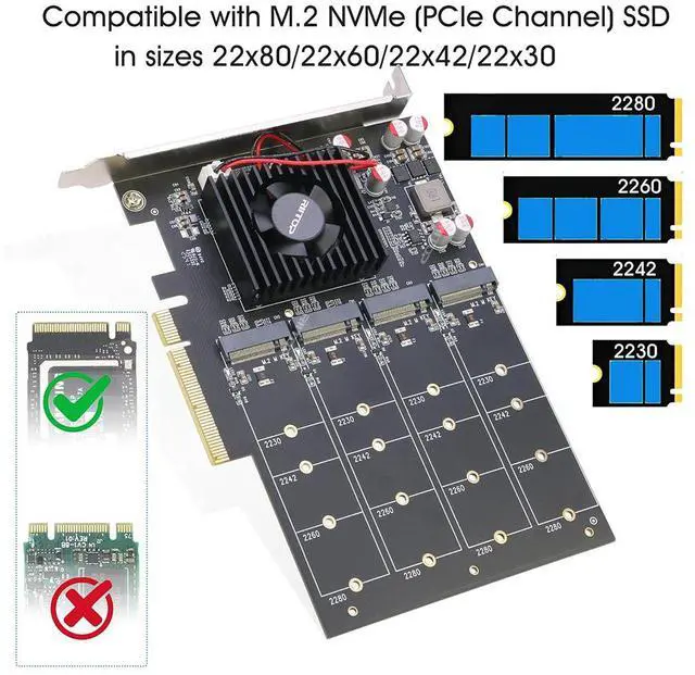 Compatible with M.2 SSDs (PCI-e NVMe ): SSD in Size 80x22mm, 60x22mm and 42x22mm. Hardware Requirement: Available PCI-e x8/x16 Slot on Mainboard, Compatible with PCI-e 4.0/3.0/2.0/1.0 standards.