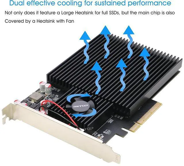 [Effective Cooling for Sustained Performance]RIIOP PCIe NVMe 4Port Card not only Includes a Large Aluminum Heatsink for all slots to actively draw heat away from NVMe SSDs, but also a Fan covering on Main Chipset, Both of them preventing thermal throttling and ensuring SSDs stable, longterm reliability.