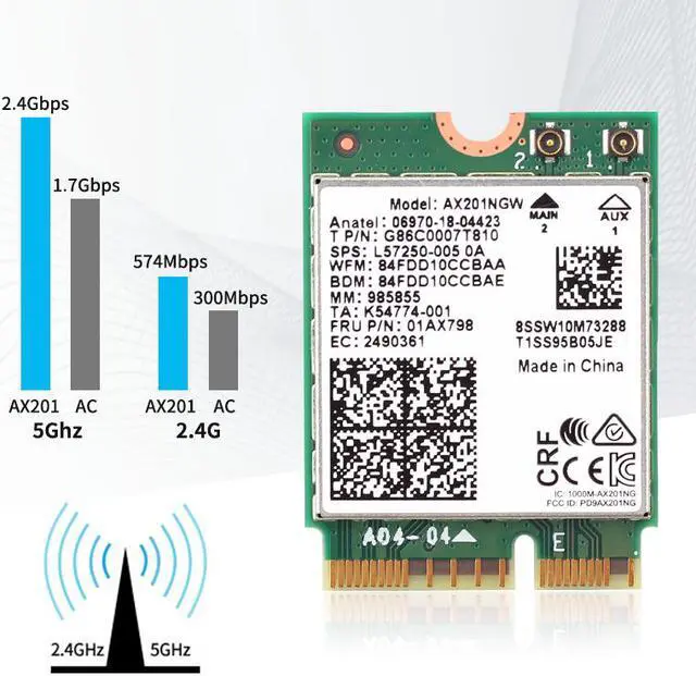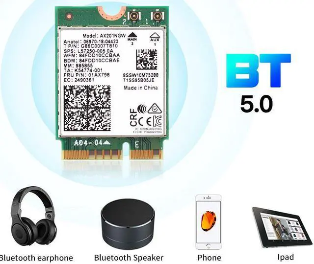 The Wi-Fi 6 AX201 adapter is a CRF(companion RF module)supporting the integrated wireless 802.11ax solutions from Intel.The solution provides Bluetooth 5 and 2x2 802.11ax Wi-Fi.The maximum throughput supported by the Wi-Fi 6 AX201 is a speedy 2.4 Gbps(160Mhz). The AX201NGW can provide Gigabit download speed1 and dramatically improve your connected experience at home, work, or on the go.