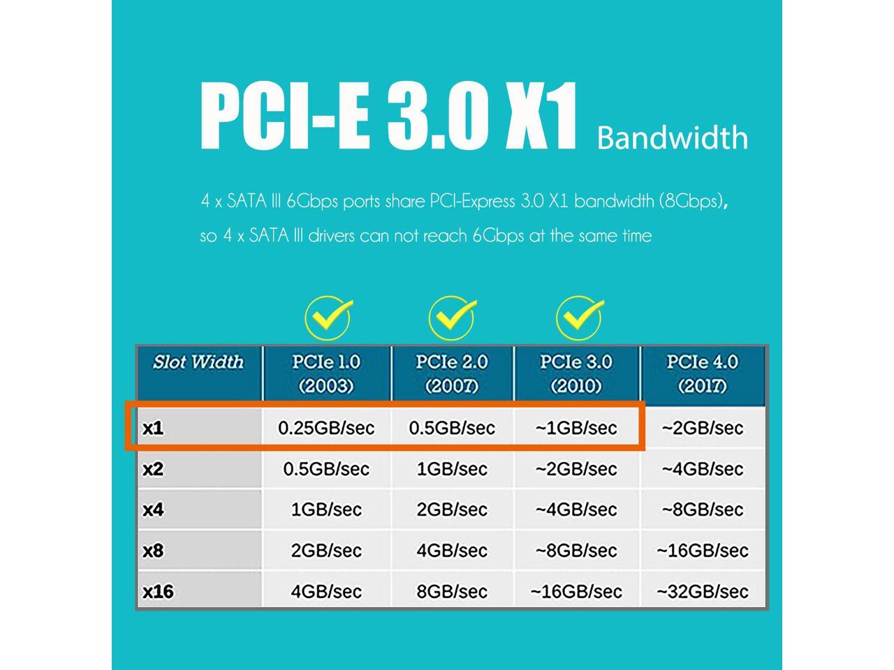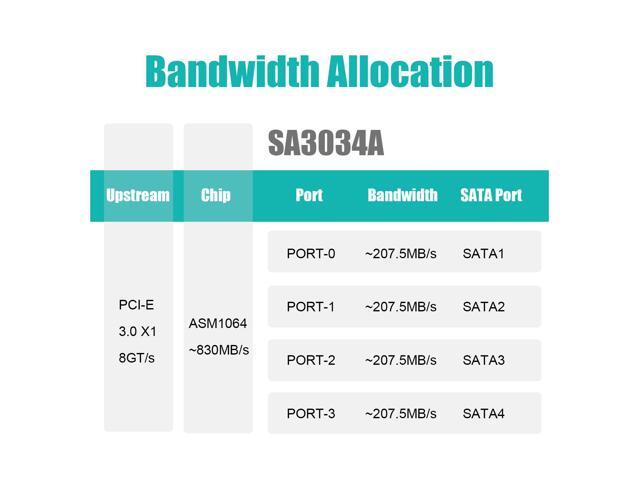 - Based on the ASM1064 chip, Upstream is PCI-Express 3.0 X1 Speed: 4 x SATA III 6Gbps ports share PCI-Express 3.0 X1 bandwidth (8Gbps), so 4 x SATA III drivers can not reach 6Gbps at the same time.