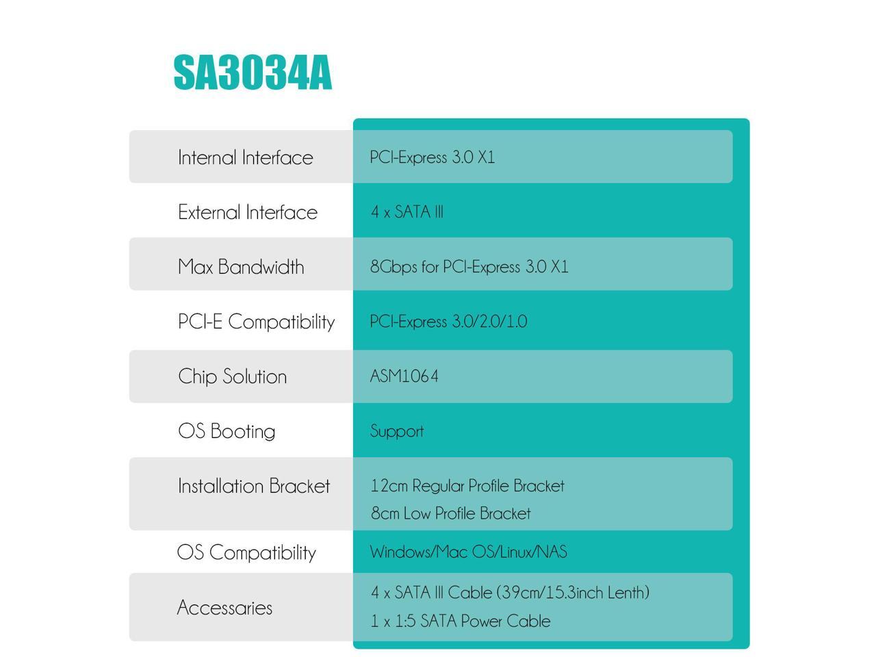 - 4-Port PCIe X1 SATA Card: PCI-Express X1 extends 4 x SATA III 6Gbps ports, then PC can access 4 x SATA drivers simultaniously. You can set up a storage pool, or configure Software RAID in Windows/Mac OS/Linux. (Noted: Can not support Hardware RAID)
